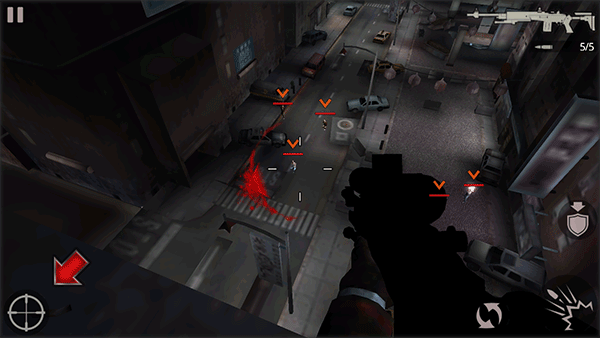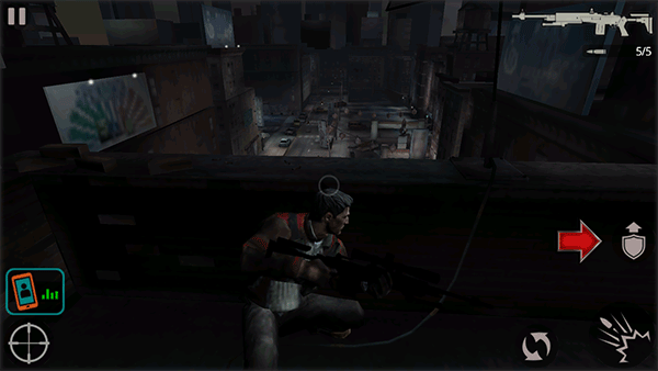1、安装好杀手2影子阴谋手机版,游戏开始我们将身处天台上,并在一个掩护的状态。点击右侧的盾牌箭头图标,主角将站起离开掩护。