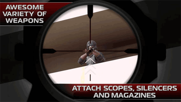 4、可定制的武器装备,升级武器的范围,消音器,和杂志,弹药,和外观,包括投掷小刀,防弹衣,和指节铜环。