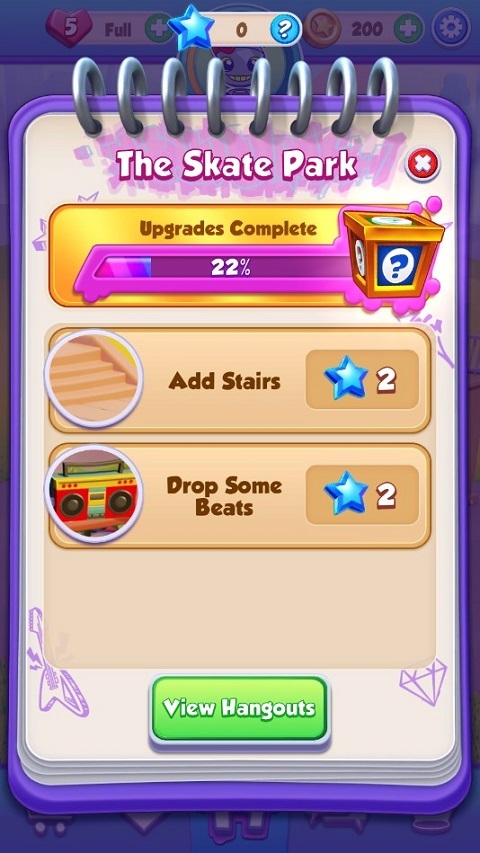 3、通过消除关卡可以获得星星奖励,星星是用于修建The Skate Park的重要资源,返回主界面,点击“宝箱”图标按钮,点击绿色按钮进行使用。