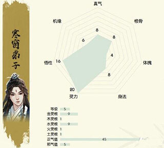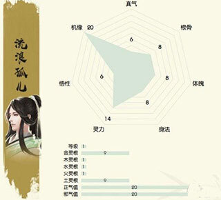 流浪孤儿身世在一等级的资质不错,机缘为二十,灵气为十四,身法和体魄、根骨为八、真气和悟性为六。此外,流浪孤儿的土灵根、正气值、邪气值、金灵根都很高。