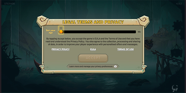 2、顺利进入游戏后,会出现选择年龄的界面,将上方的可拖动条滑动到18岁及以上的位置,接着点击下方的ACCEPT按钮,就能进入游戏了。