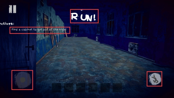 4、出现【RUN】提示时,操控角色奔跑躲避,利用左侧移动、右侧跳跃按钮,在走廊找橱柜躲避,等黑夜过去即可完成逃离。