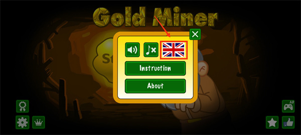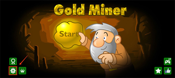 1、进入黄金矿工手机版小游戏,点击界面左下角的设置按钮;