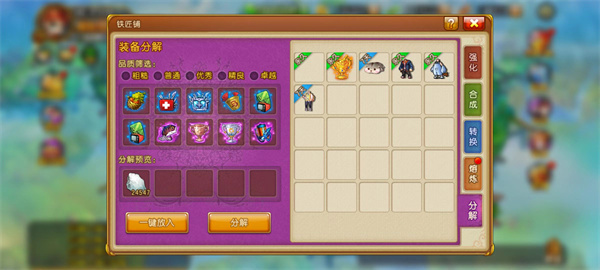 首先点击主界面的铁匠铺,选择【分解】然后在界面的左边出现不同品质的道具,玩家可以选择这些道具进行分解,也可以点击一键放入,每次最多可分解10个道具!