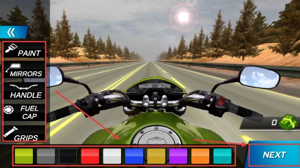 1、在摩托定制界面,选左侧【PAINT】等自定义类别,再选择具体样式,改好后点击【NEXT】。