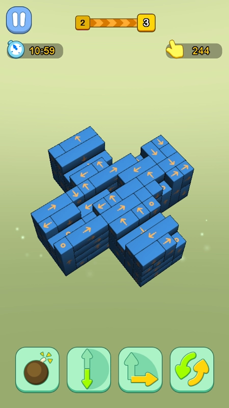 2、配合消除:带有菱形方向箭头的方块需要其他靠近的箭头进行配合才能消除,这种设计鼓励玩家进行更复杂的思考和操作。