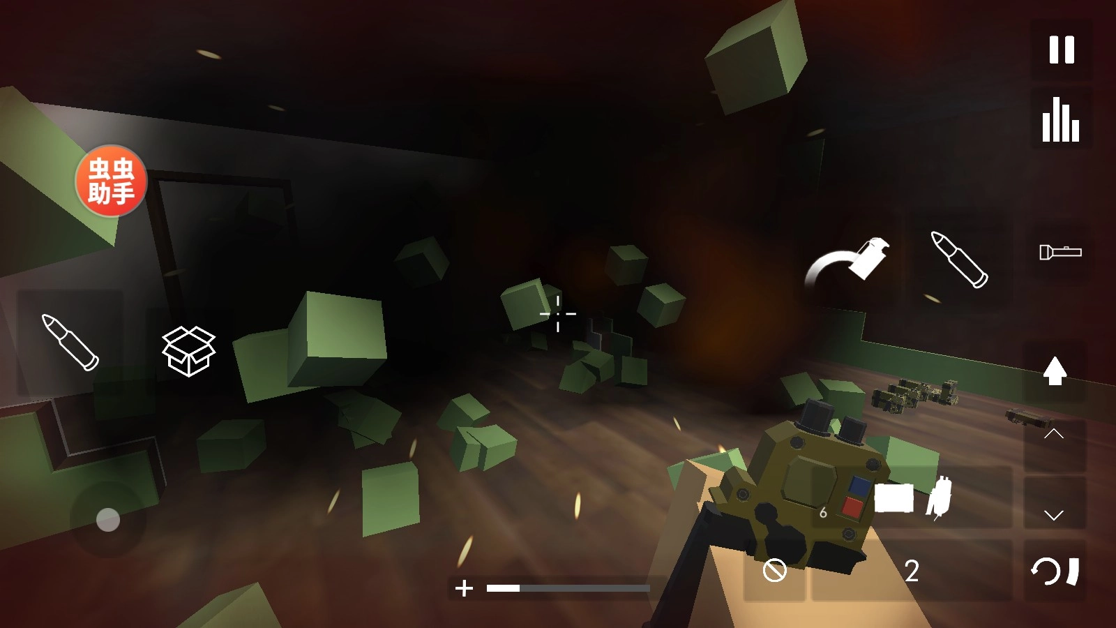 3、进入后,通过左侧的摇杆控制移动,右侧的武器点击即可切换,上方的子弹则是攻击。
