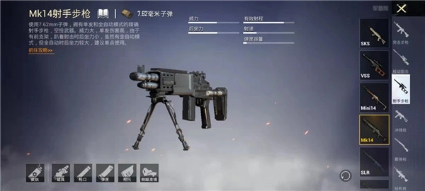 MK14则是游戏中伤害最高的一把连狙,伤害高还能连点,其作用完全不输AWM。只要给MK14配一个托腮板,MK14连点起来还是很舒服的,手感相当不错。此外MK14还是少有可以全自动的狙击枪,另一把可以全自动的狙击枪是无人问津的VSS。