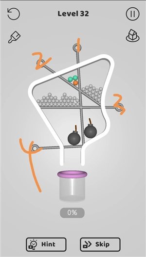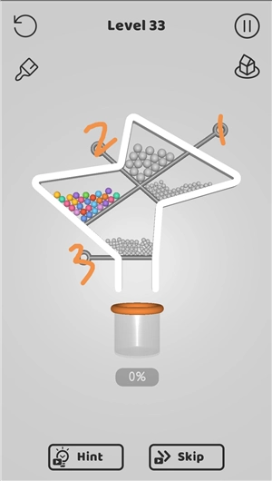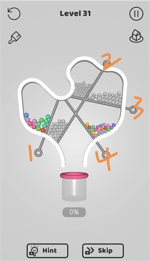 3、玩法原理简单,重力会把球拉向管道,只是别针挡住了路
