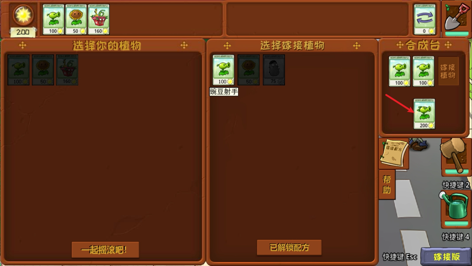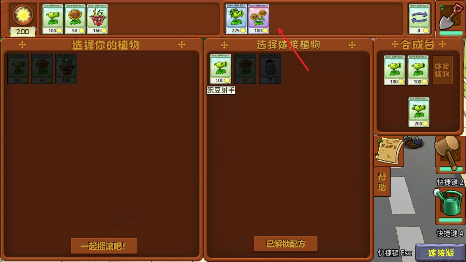 2、也能够点开旁边的合成台,放置植物进行嫁接,从而得到新的植物。
