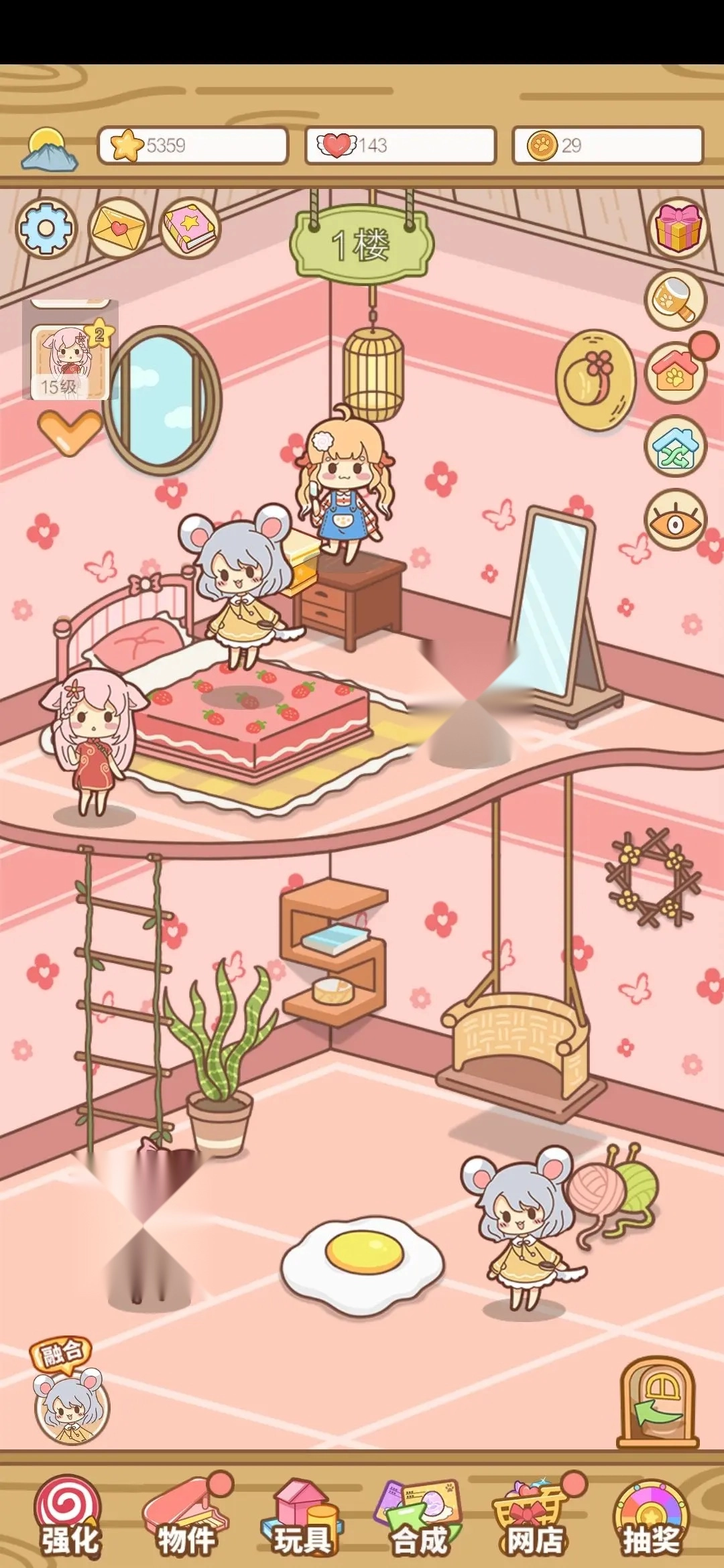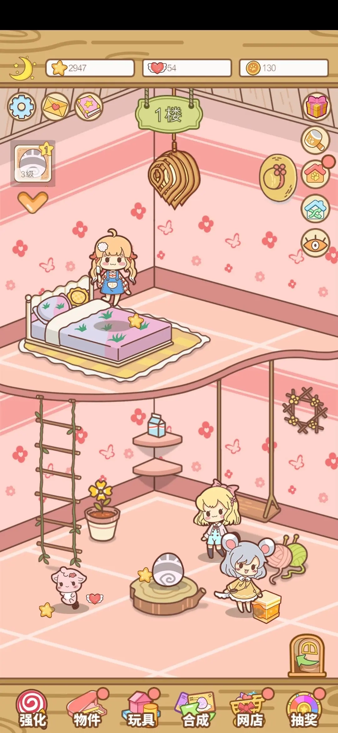 3、长待机别抽奖,抽奖会掉越层卡,比如1层出6-8级卡、二层11-13、三层没注意,四层21-25(唯一下层全楼层),五层26-29。大家会说掉了不是很好节约了时间,nonono,第一次合卡必定掉装饰,直接抽奖得到是不给的,会自动进入广告池,然而有bug不知什么特定情况装饰会抽不到,这也是很多人卡物件全满但没200其中一个原因。说到装饰没满200,很多攻略都提到是因为合星卡掉的所以没满,但我第二次重玩时,每层都升满5级并且记录每个宠物都掉落装饰后才进下层,1个个5星养确定1-4星掉装饰才升5星,否则就丢弃重养每个,但最终还是198/200,所以推测认为不仅仅合星吞提前掉后面层的卡也会吞装饰导致抽奖抽不出,所以1层合完10级卡再开始抽奖,2层要15级以此类推,当然其实合满30,5层才再开始抽奖也没事,反正养6星养那25个时间足够之前看抽奖和广告抽奖全部时间了