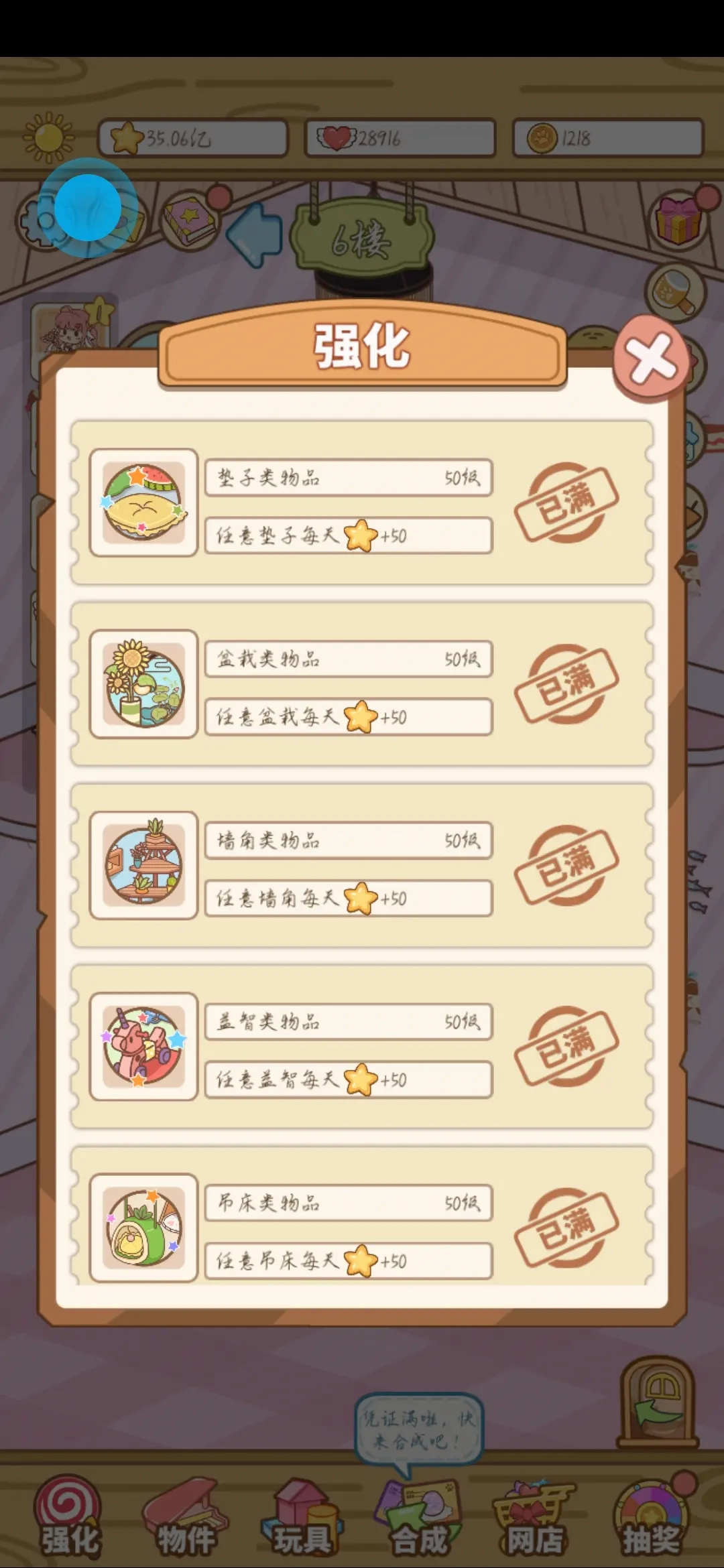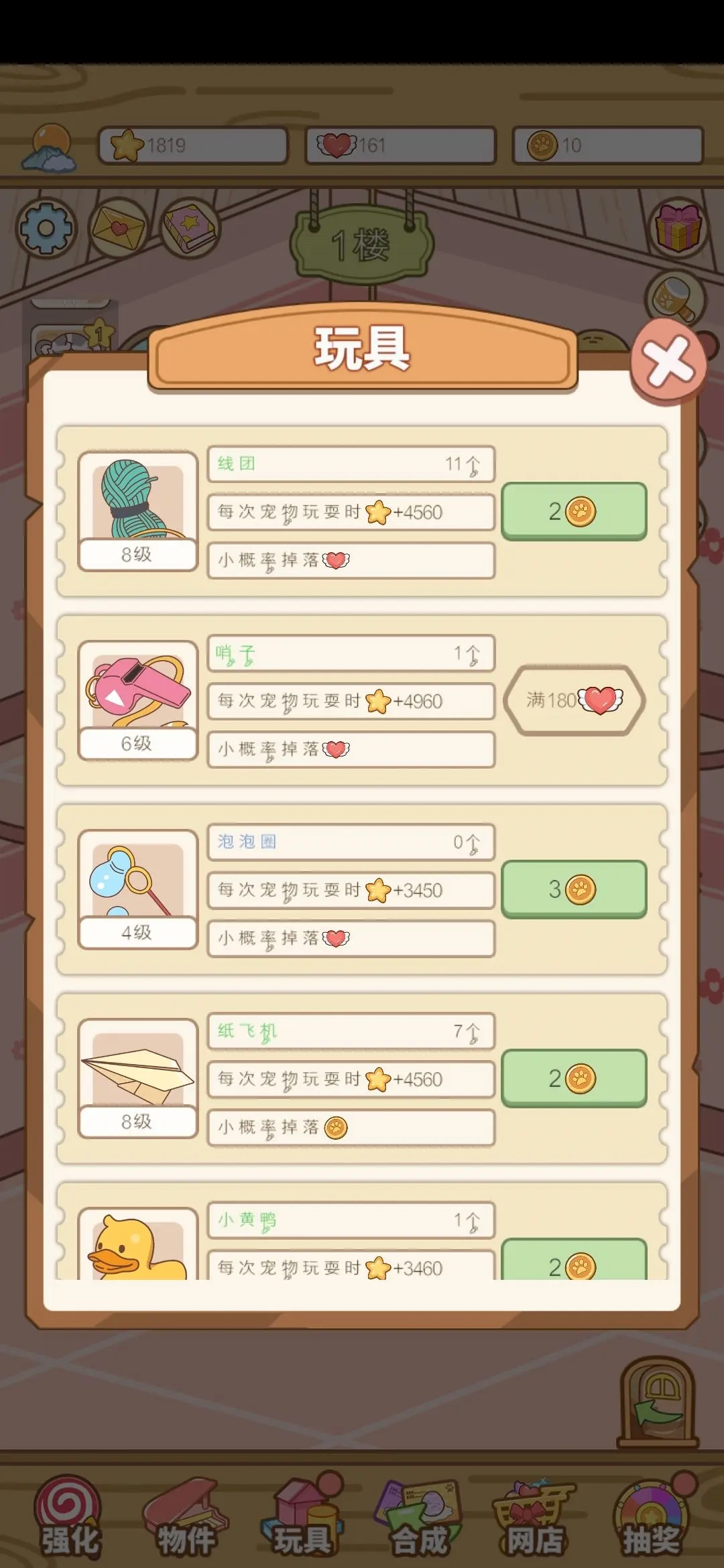 上图右下角的“网店”是每5分钟刷新一次商品,所以刷新了就马上买光,一般来说稍微玩一会儿金币对于网店就不会不够用,大家可以把网店理解为定时刷新的随机商店,而玩具则是给商品升级的地方