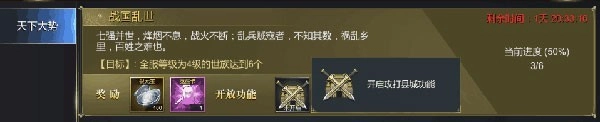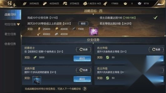 各位君主们在不同等级时,如无主线任务时,则需要积极完成各项战略目标,完成整套战略目标任务,可以获取丰厚的君主经验。部分分支任务需要完成指定数量的分支任务,分支任务有不同类型,可以消耗资源进行刷新,刷新分支任务的价格会随着次数递增,每天24点重置。