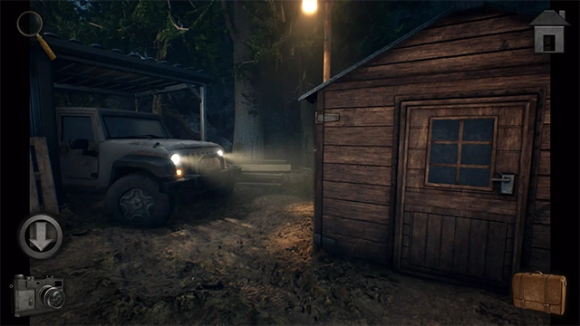 2、出门后注意到保险丝盒损坏,且位置过高无法触及。返回左侧路径走向海滩,登上船找到车钥匙,开启车灯照亮前方的小屋。