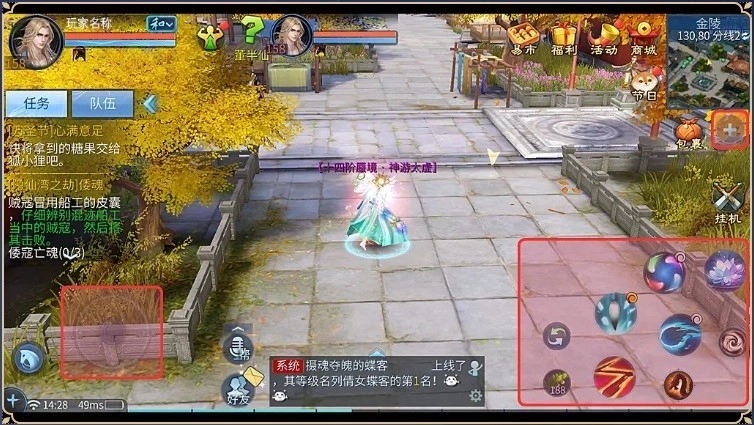 拖动左下方摇杆可以移动角色,点击屏幕也可使角色移动至指定位置,右下方为释放技能和使用药品的按钮,点击右上方“+”键可以将右侧按钮切换至功能页。