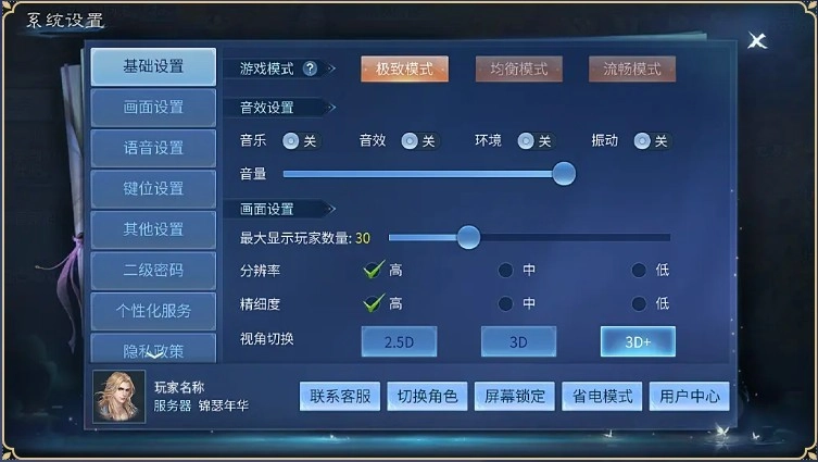 点击界面右下角【设置】,即可进入系统设置界面,可在此进行画面、音效、视角等多项设置的调整。