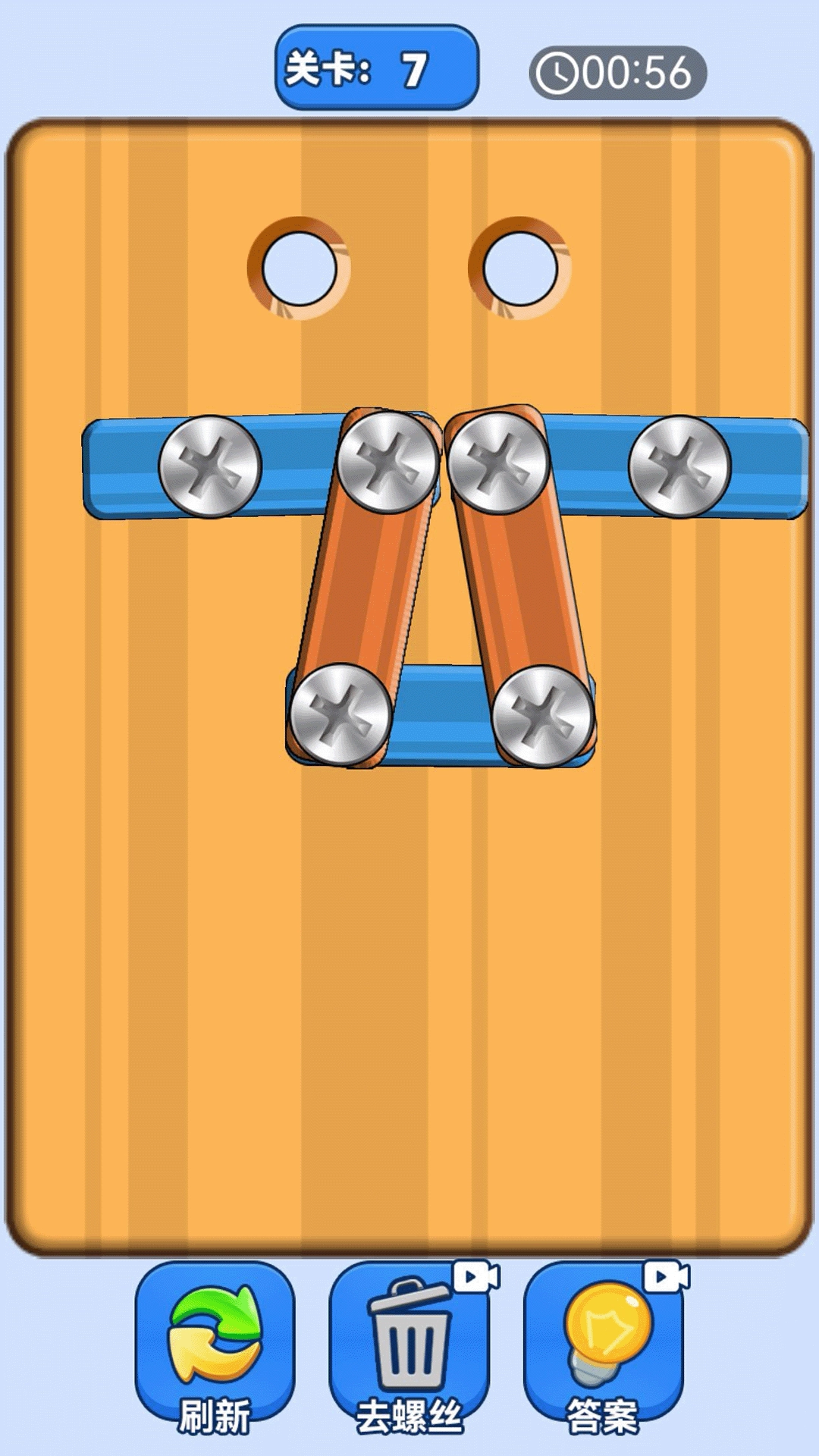 4、请合理运用下方的道具,其中“去螺丝”是关键操作键;若在关卡中遇到阻碍,可通过“答案”键来获取拆解的思路;而“刷新”功能则能够重置当前关卡的布局。