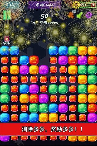 2、规则超简单,找到并消除两个以上的相同颜色的方块,相连方块越多,得分越高。