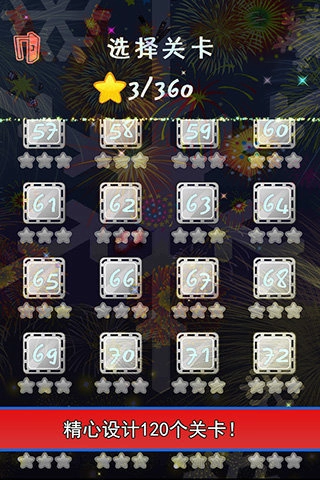 2、在游戏中你要点击两个或是更多相同的星星进行消除,该作中并没有设定时间限制,但是需要注意的是每一关中都拥有不同的目标分数,如果玩家玩家不达标的话就会直接挑战结束。