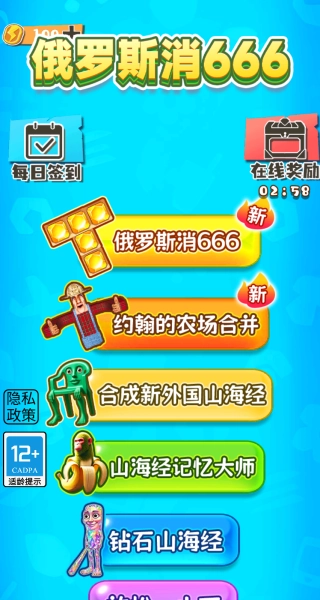 2、包含了多样的玩法模式,有俄罗斯消666,约翰的农场合并,合成新外国山海经等。