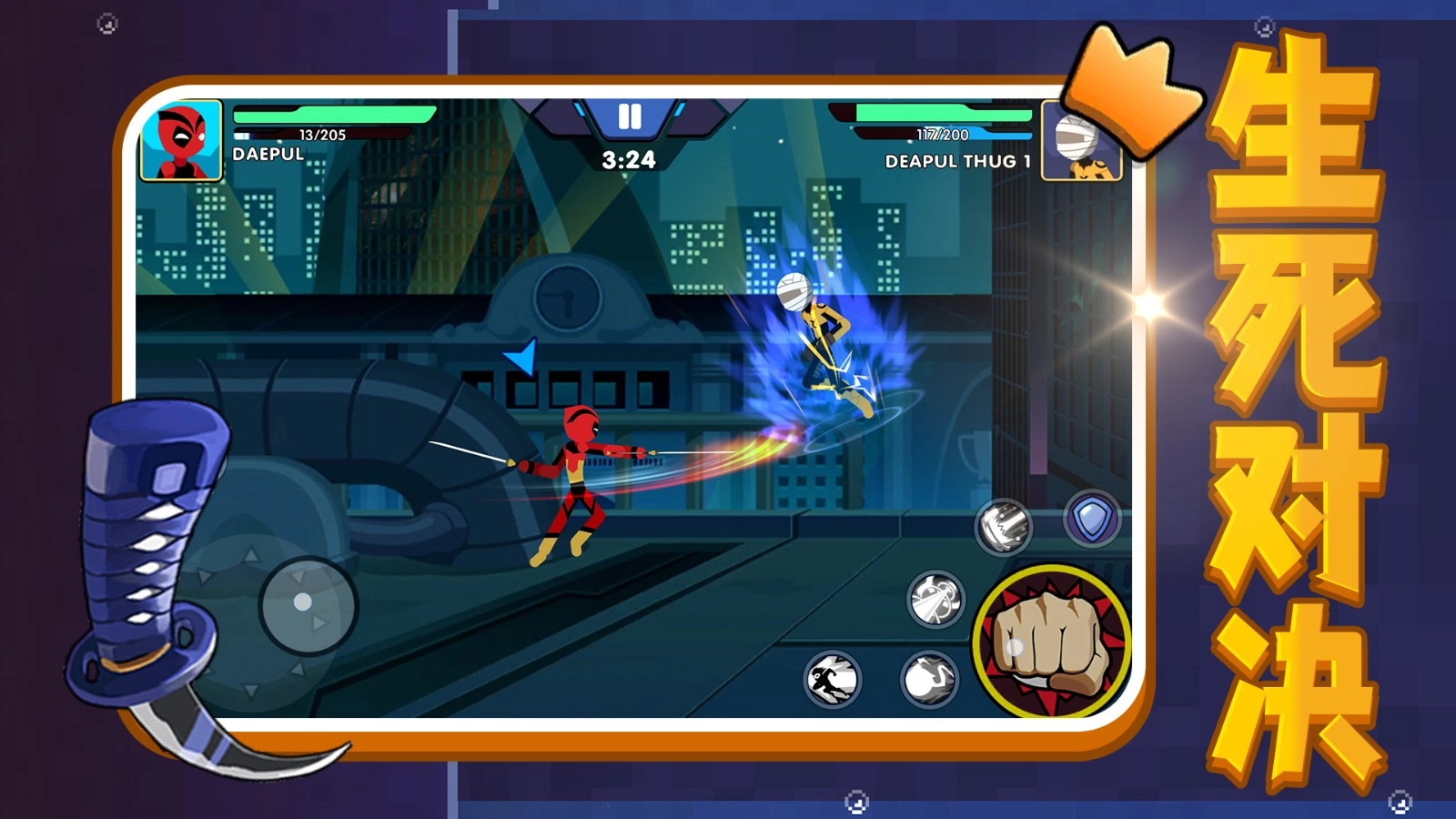 3、对战开始后,点击左侧按钮控制角色移动,右侧有各种技能攻击按钮,根据战况灵活使用。