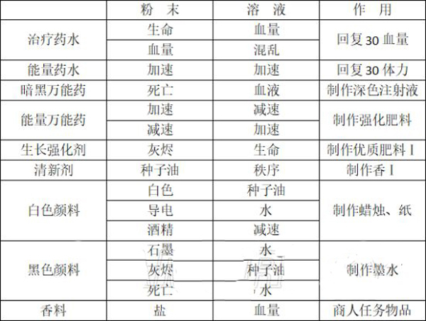 原料有八种常规类型:加速、减速、血量、有毒、秩序、混乱、生命、死亡,它们各自有对应的颜色