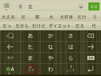 接下来是浊音,在输入该浊音对应的轻音后,立刻点击第四行第二个标有“小”字的图标。例如,若要打出だ,就先打出た,然后按一下标有“小”字的那个键。对于半浊音ぱ,需连续点击“小”字图标两下,具体操作可参照下图。