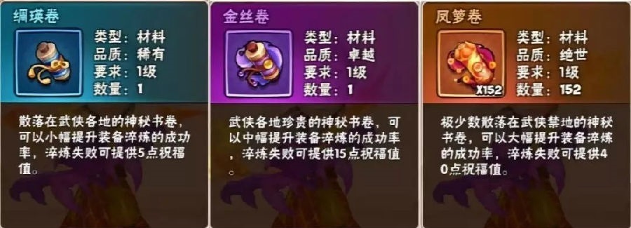 然而,淬炼绝非轻而易举之事,其中既有成功的可能,也难免会遭遇失败。倘若大侠期望让淬炼过程更为稳定,那就需要耗费绸瑛卷、金丝卷或者凤箩卷,以此来提高淬炼的成功率。而神秘书卷可通过挑战襄阳城获取。