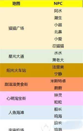 各类地图所包含的NPC各不相同,NPC的昵称呈现为黄色,且位置固定不变。只需点击小地球,小地球便会告知你NPC的所在之处。此外,开心电玩的小编精心为大家整理了一份场景与NPC对照表,可供大家参考。