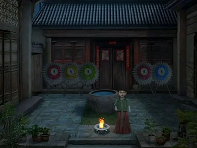 先进行搜刮,在左上角的树枝堆中获取柴火,右下角的竹筛子里找到木炭,于左边灶台下方拿到一盒火柴与草木灰,顺便将柴火放置在上层,接着用火柴点燃柴火。左上角那排抹布的颜色和外面花圈一致,因此按红黄绿红蓝的顺序调整,可得到一把钥匙。查看右上角的柜子,男主已提示用刀割开即可,剧情过后查看柜子左下角,用钥匙果然拿到菜刀。对上面的柜子使用菜单,就能拿到面团。查看左边灶台上,拿走木盖子,放入面团,切换场景回来便拿到米糕了。