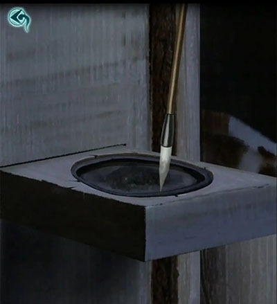 先在中间位置取到一个水桶,出门后用水桶在水缸处获取水。回到原处,往弹出的砚台上洒水,接着放上草木灰,然后使用墨块。查看右边塑料布,提示在此处给衣服染色。再看中间位置的绿色颜料,提示已干掉,继续用水桶获取绿色染料。然而此时没有工具,查看右下角的箱子,提示为三角形 - 方形 - 圆形,依据日历上的线索得出密码081828。调整好密码后打开,拿到刷子和毛笔。