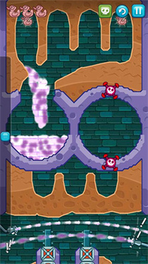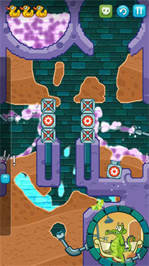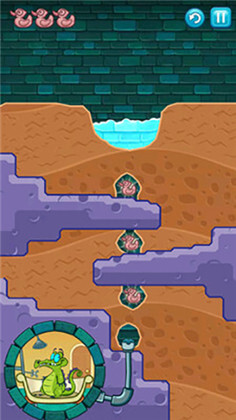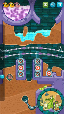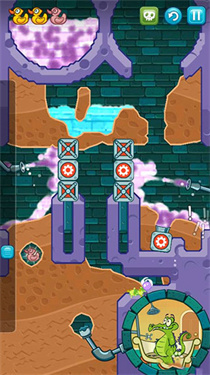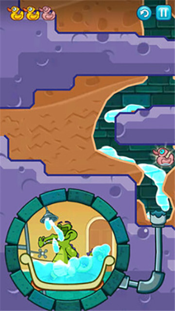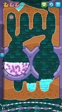 8、挖出如图一样的路来,将清水引下,收集到最后一只鸭子,最后将水引入小顽皮的浴室即可过关。