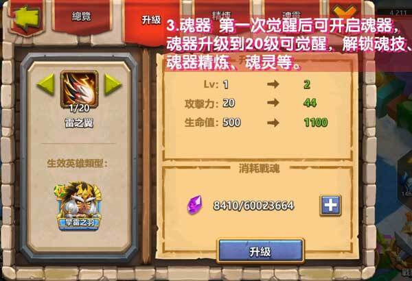 3、魂器 第一次觉醒后可开启魂器,魂器升级到20级可觉醒,解锁魂技、魂器精炼、魂灵等。
