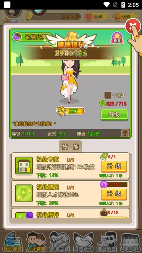 2在21世纪,什么最为珍贵?答案是人才。对于一个立志成为首富的人而言,身边怎能缺少“自己人”相伴。随着你自身身份与名望逐步攀升,模特圈、明星圈、企业圈、投资圈以及上流贵族等五大圈子的各类人才,如同潮水般纷纷涌来,汇聚在你的旗下,任由你调遣使用。要知道,所有这些精英人才,都需要投入一定的时间与精力去悉心培养。借助在投资过程中积累的丰富阅历,助力他们持续成长,实现自我突破,进而提升各项技能。