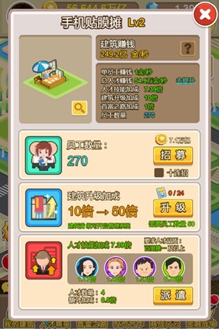 招募员工是迅速提高赚钱速度的途径之一,仅需消耗金币就能加快赚钱速度,不过消耗的金币数量会逐步增多。提升建筑等级能够带来吸引人的倍数加成,用于升级所需的建筑卡,可通过商战兑换或者在商店购买获取。