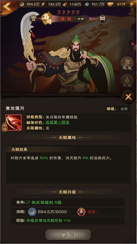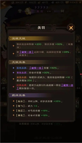 接下来我们再看下关羽的天赋羁绊以及觉醒分析,关羽作为一个武将,所有天赋都是围绕着伤害来的,天赋效果升到红色关羽即为质变,相当于开局就可以使用一次破军打出成吨的伤害。
