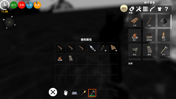 5、在背包内可以看到自己获得的资源,当自己的耐力、生命、饥饿数值低时需要食用东西来维持;