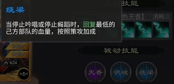 当停止吟唱或舞蹈时,回圝复最低的己方部圝队的血量,按照策攻加成。每级效果:提升30%治疗加成。