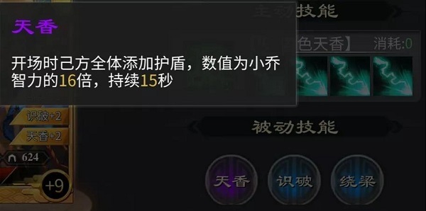 LV1: 开场时己方全体添加护盾,数值为小乔智力的8倍,持续15秒。