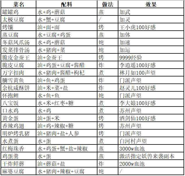 目前已经收集的菜谱配方共有22种,已经用表格方式列出,需要注意的是,不同的菜品的做法也不尽相同,各位在做菜的时候注意自己的做法是否正确。