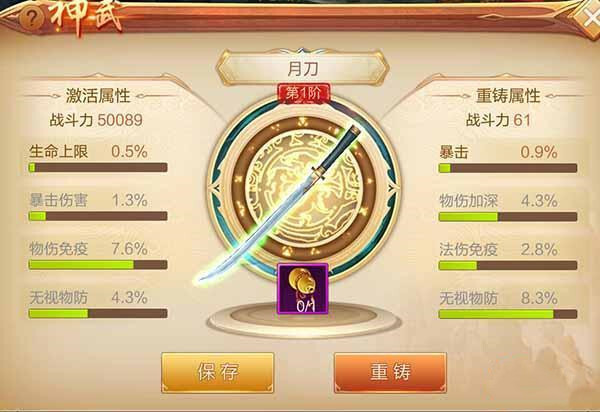 在神武中,每次升级玩家都能获取一个“祝福点”。当祝福点累积至上限时,便可提升等阶。游戏内共有4个等阶,每提升一阶,玩家就能获得额外属性。具体而言,第一阶解锁生命上限,第二阶解锁法术防御,第三阶解锁暴击伤害,第四阶解锁法伤免疫。 不仅如此,每一阶的神兵都拥有独特外形,可供玩家幻化,类似于时装皮肤。此外,若玩家对神兵属性有所不满,还能通过重铸来随机Roll点,直到刷出满意的属性再进行保存即可。