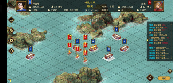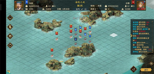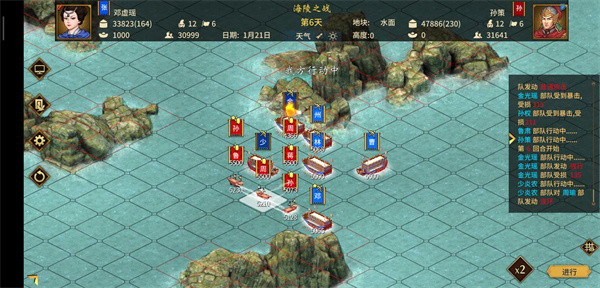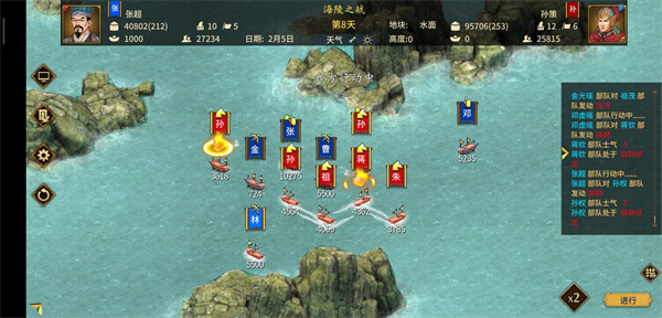 安排一位携带计略火船的武将操控火船,火船行进路线上不得有我方舰船(火船直线行驶,不会转弯,若途中存在我方部队,易导致误伤),火船一旦成功使用便会进入自动行驶状态。