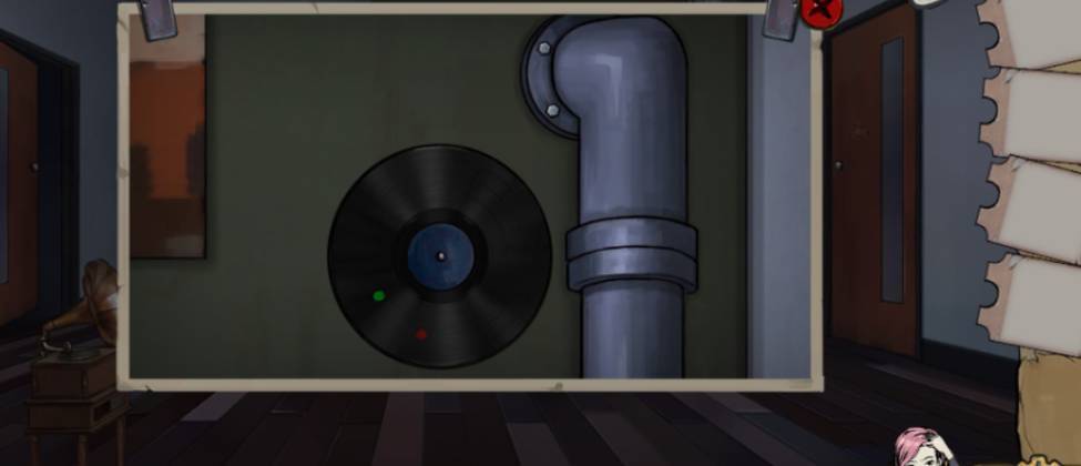 9、切换右下角头像,回到有男人雕塑房间的传送带,捡起盐,将盐撒在水管旁边的唱片上,获得唱片。