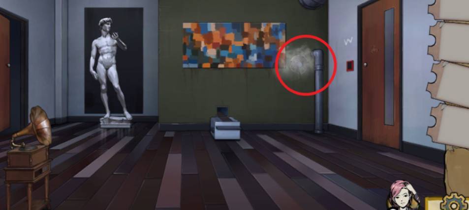 7、捡起装满水的水瓢,回到蓝色房间,将水倒入破裂的地板下,获得一把钥匙,接着用剃刀割开蓝色玩具,获得一个石膏苹果,将石膏苹果放到传送带上送过去,回到有男人雕塑的房间,捡起苹果,将苹果放在雕塑手上,获得门卡。