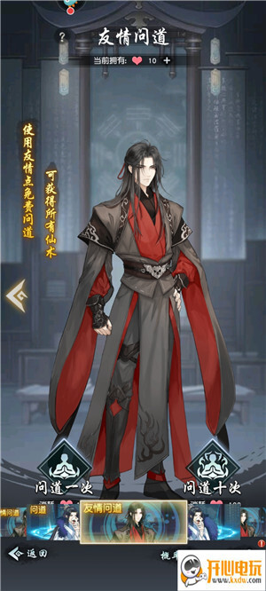 玩家在解锁角色的信息时可以获得友情值,这个可以用来进行友情问道,也是获得仙术的一种重要方式(友情问道一次消耗10友情值)。
