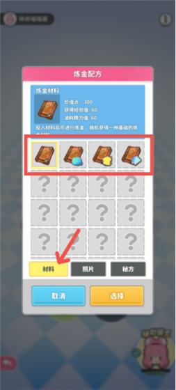 基础炼金材料可以使用任意4种点数,其他炼金材料-猫灵,炼金材料-服装,炼金材料-秘宝则需要使用对应的材料转换点数。