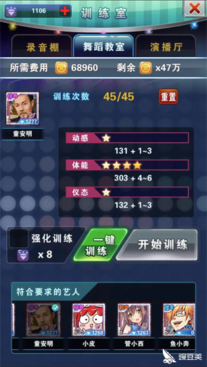 此次训练的场地设定在训练室,把训练对象调整为他。当金币数量足够时,直接将他的训练次数拉满。这里无需使用钻石来开展强化训练,若想一次性加满训练次数,就得选择【一键训练】,此操作会消耗87万金币。完成训练后,他的舞蹈属性值增长了数倍,具体参数可查看下图。
