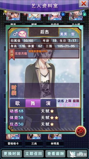为了清晰展现升级的威力,我们照样举个例子,以C级舞者后杰为例,观察他成长前后的技能和属性值。成长前,他的比拼技能是“超常发挥值+29%”,训练极限是33。