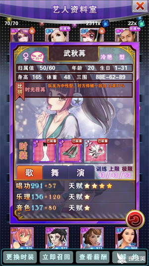 每个艺人都会受到自身等级的限制,造成技能发挥的力量,以及训练次数受阻。只有将艺人成长,才能提高他们的这两项数值。