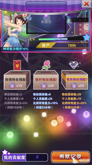 另外如果你能积极给她捐赠钻石,那么钟灵比拼时所有能力能够加成,最高可以加成+20%,持续30分钟。不过目前的粉丝团较少,很多玩家都找不到自己主力艺人的粉丝团。